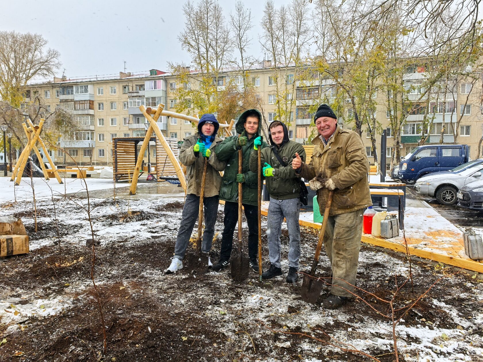 Благодаря инициативе Павла Щербины и поддержке волонтеров, газоны украсили 15 берез и лиственниц. Павел Федорович уже семь лет занимается выращиванием саженцев на своем дачном участке, и в 2024 году его проект по озеленению городской среды стал победителем конкурсного отбора, получив грант от Горнорудного дивизиона Госкорпорации «Росатом».