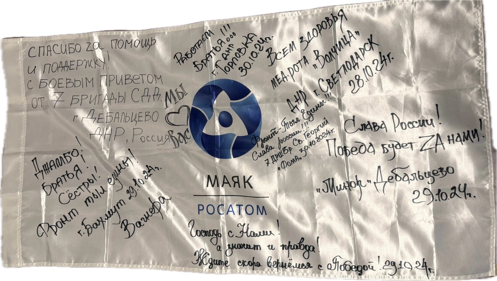 За помощь и поддержку бойцы передали ценные слова благодарности и подписали флаги, а также использованный 120 снаряд от пороховой части. Все эти бесценные подарки найдут своё место в музее ПО «Маяк», где они будут хранить свою историю и память.