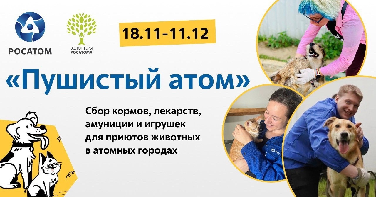 С 18 ноября по 11 декабря в Госкорпорации «Росатом» проходит акция традиционного волонтерского проекта «Пушистый атом», который направлен на поддержку приютов, организаций и волонтеров, помогающих безнадзорным животным в городах присутствия предприятий атомной отрасли.