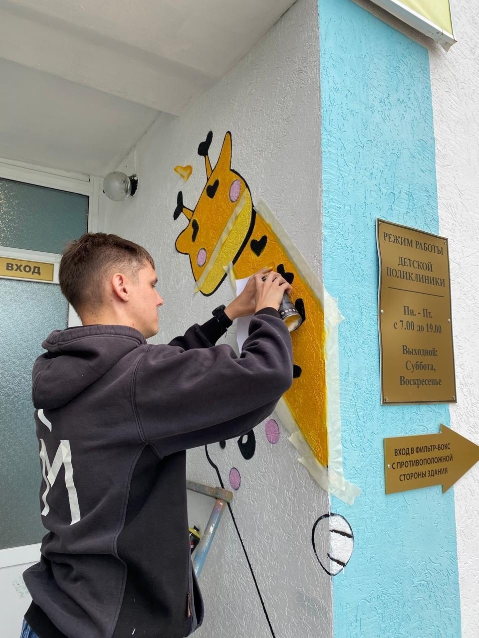 Всех посетителей медучреждения на входе теперь встречают разноцветные картинки. Эскиз композиции, нанесенной на стены и входную группу, придумали работники ПО «Старт». Все изображения были согласованы с руководством детской поликлиники.